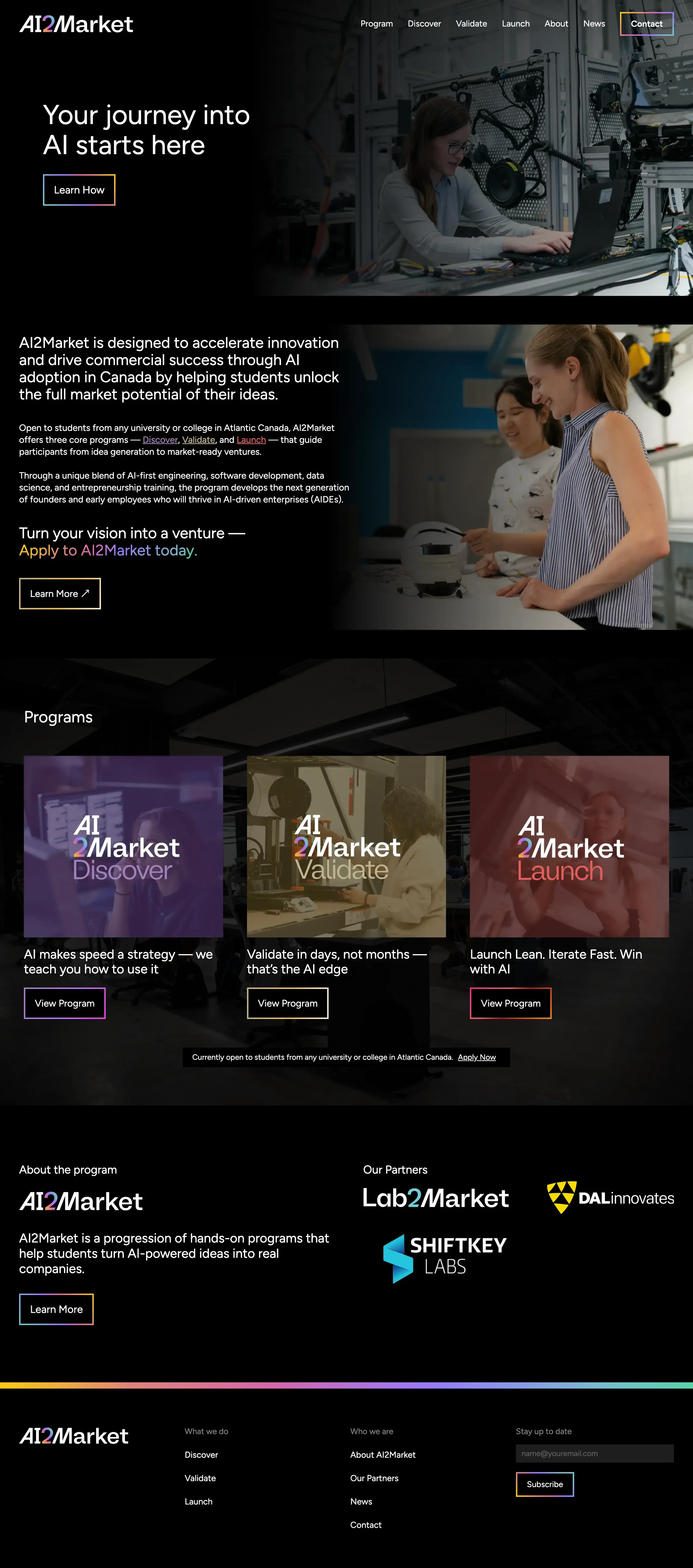 Open to students from any university or college in Atlantic Canada, AI2Market offers three core programs — Discover, Validate, and Launch — that guide participants from idea generation to market-ready ventures.